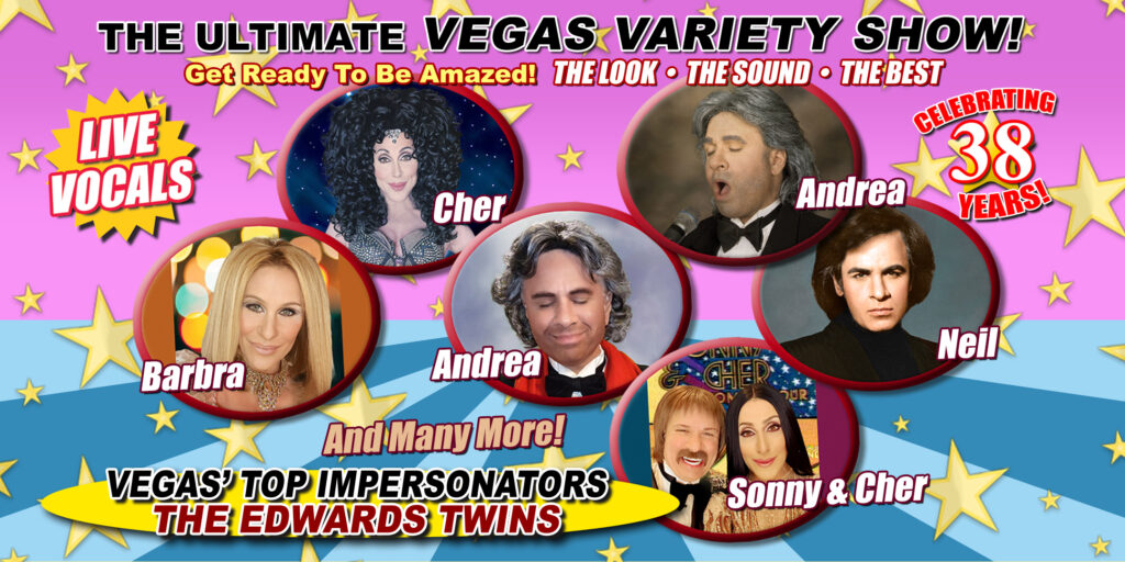 Remember all the wonderful Variety shows we all grew up on in the 70’s & 80’s? Now is your chance to see them live and re-created by Las Vegas’ number one impersonators of all time. All your favorite legendary Superstars come alive in “An Evening with The Stars”. The NBC Today show says “it’s one of the most extraordinary shows we have ever seen.” Sonny & Cher, Billy Joel, Elton John, Neil Diamond, Lionel Richie, Stevie Wonder, Ray Charles, Lady Gaga, Celine Dion, Rod Stewart, Bette Midler, Barbra Streisand, Andrea Bocelli, Frankie Valli, Tom Jones, and many many more hosted by THE EDWARDS TWINS FROM LAS VEGAS. All live vocal. USA TODAY and THE BOSTON GLOBE raves “A Must see show” Each Star sings their number 1 hits as well as of your favorite Songs…